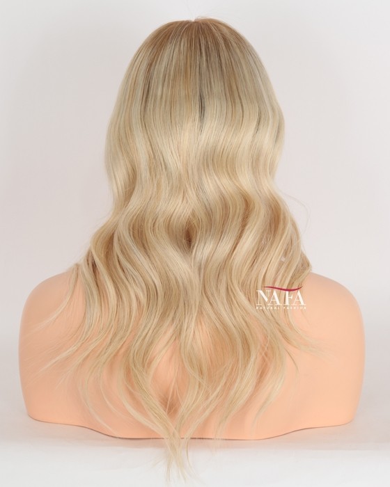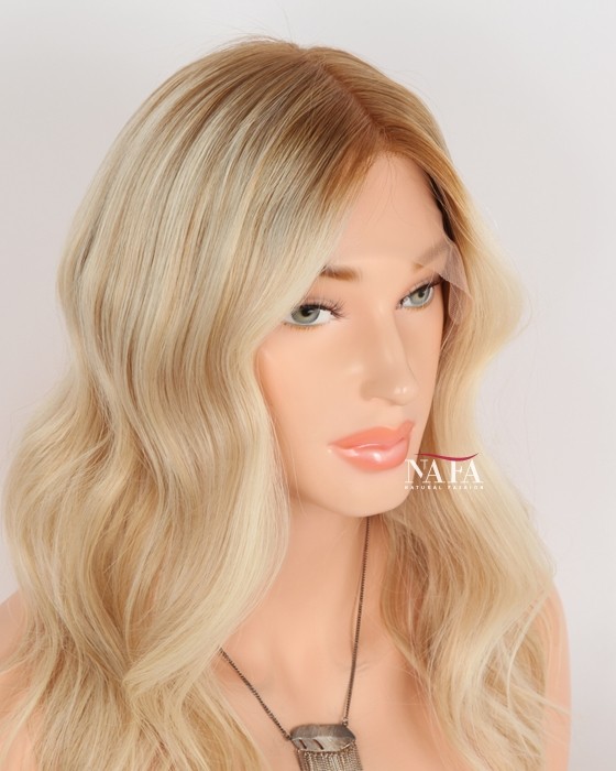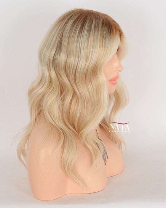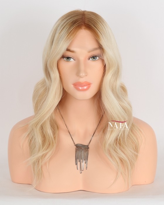 Bold Contrast with Natural Elegance: 14-Inch Slight Wave Skunk Stripe Blonde Ombre Wavy Wig