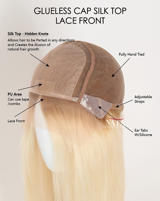 Cap Construction: Lace front glueless cap with silk top, non-slip in sides
