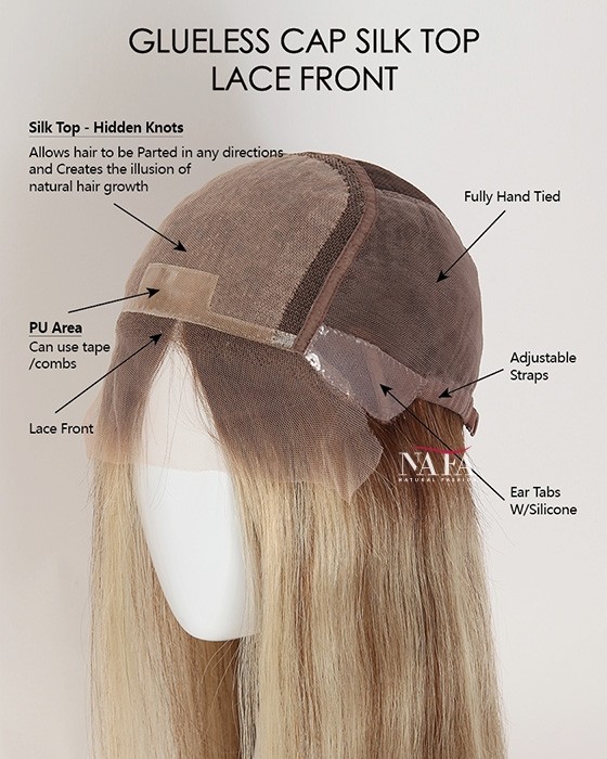 Cap Construction: Lace front glueless cap with silk top, non-slip in sides